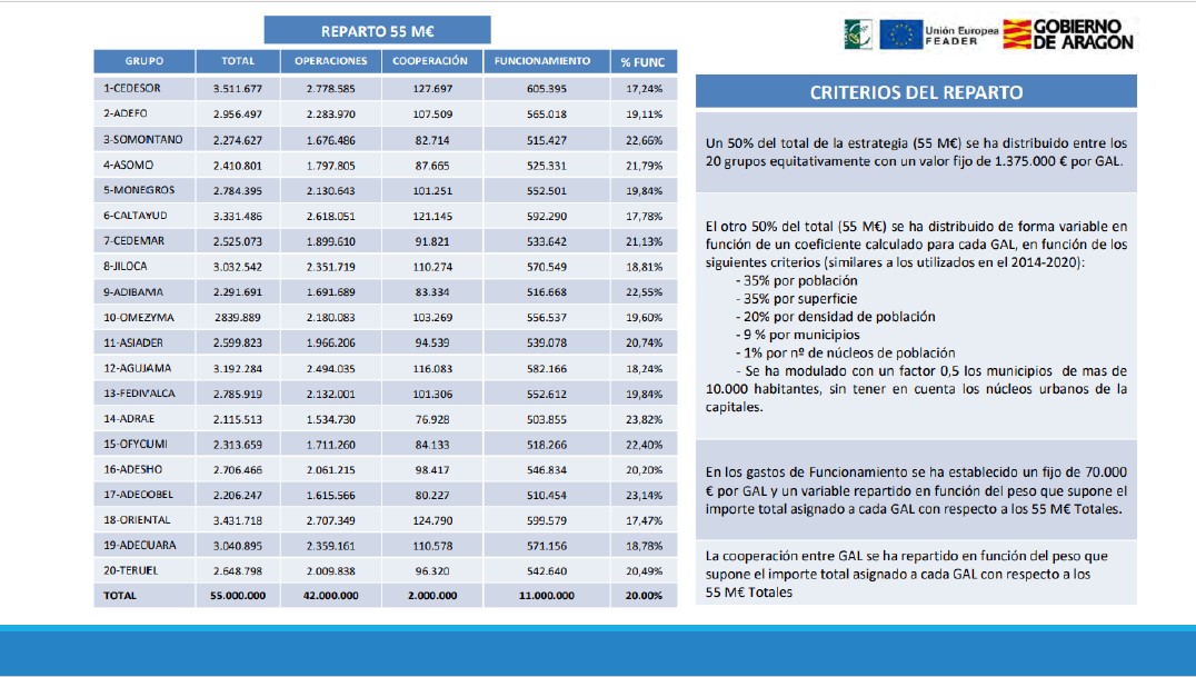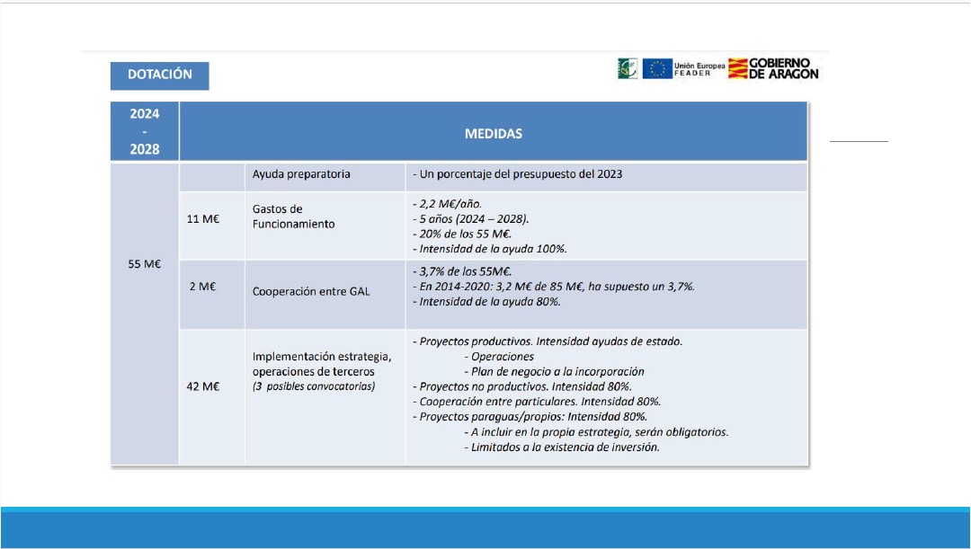 La dotación total para el 2024-2028 es de 55 millones de euros, con 11 millones para gastos de funcionamiento, 2 millones para cooperación entre los GAL, y 42 millones para implementación de la estrategia. Una de las novedades principales para el nuevo periodo es que en el reparto financiero se reserva un 10% de la financiación prevista, que será distribuida en función de la calidad de las estrategias (valoración que lleva a cabo el Gobierno aragonés en base a esa defensa ya comentada) y si estas estrategias está estructurada en torno a un proyecto tractor.