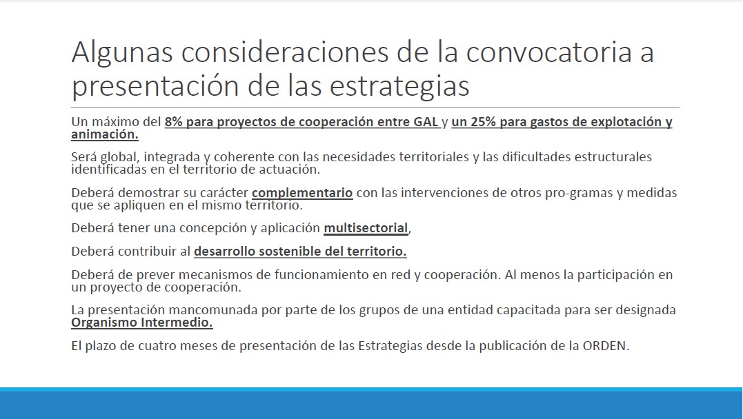 Asimismo destacó algunas consideraciones de la convocatoria es que los GAL deben formar parte de la Red Aragonesa al ser reconocida como Organismo Intermedio.