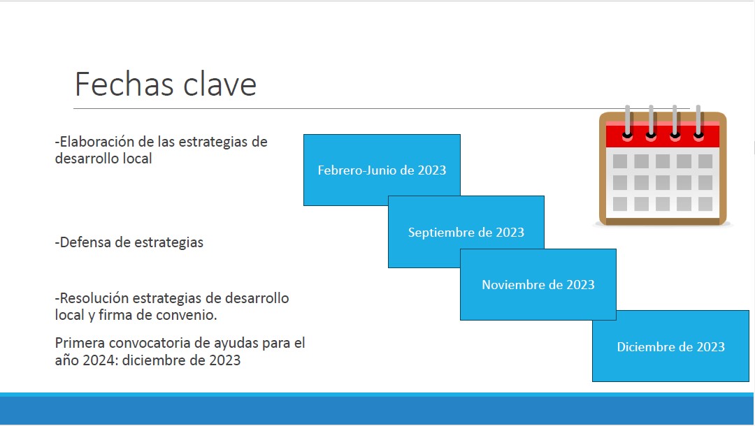 En cuanto a las fechas relacionadas con las Bases Reguladoras, las estrategias fueron aprobadas en diciembre de 2022 y la resolución se publicó en febrero de 2023. Entre los meses de marzo y septiembre tuvo lugar la elaboración y defensa de las estrategias de desarrollo rural. Esta defensa, de una hora de duración, se realizó por cada uno de los GAL ante el Gobierno de Aragón, que realizó una valoración sobre su importancia a la hora de tener en cuenta el cuadro financiero de los grupos. La resolución de las estrategias tuvo lugar en noviembre de 2023 y la primera convocatoria para el año 2024 se convocó en diciembre con dos procesos selectivos.