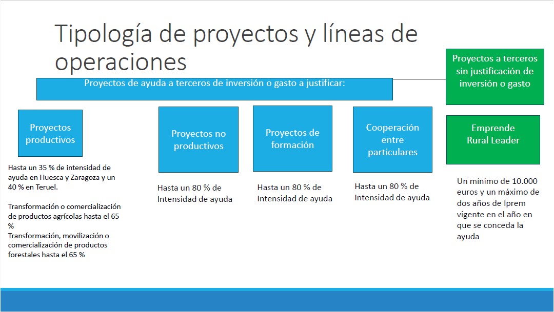 Se dividen entre inversiones productivas y no productivas, Emprende Rural LEADER, Actividades formativas y cooperación entre particulares.