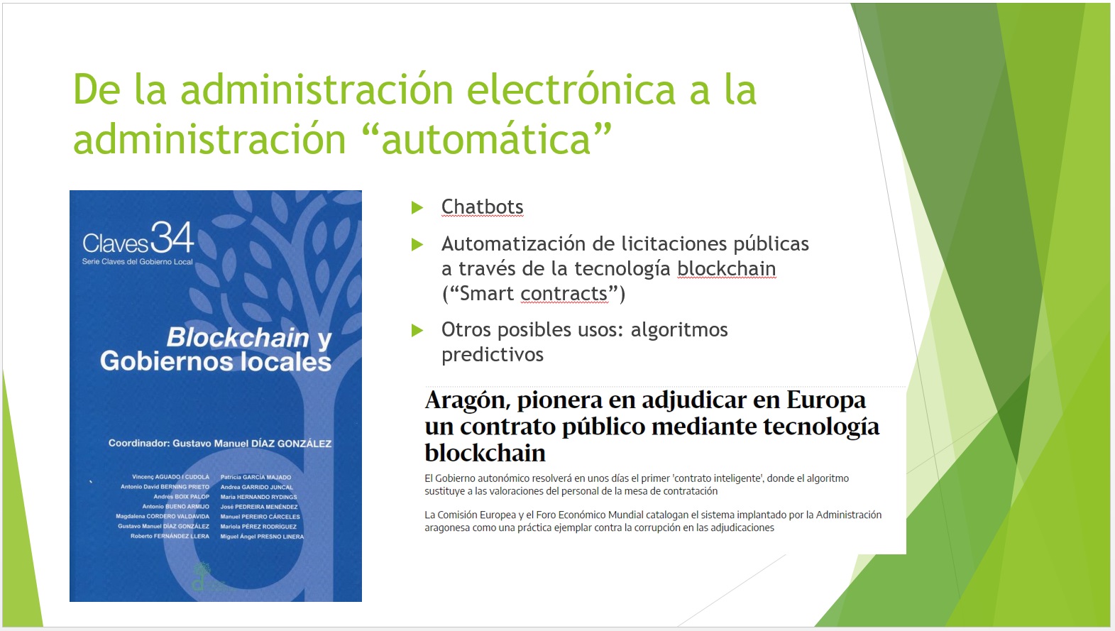 También apuntó a la utilización de la tecnología blockchain para la automatización de licitaciones públicas, los Smart contracts, donde el diseño de algoritmos se encargarían de llevar a cabo esta selección y que Aragón ya está utilizando. Unos algoritmos que también podrían utilizarse para detectar las mayores probabilidades de cometer infracciones. Como lectura complementaria apuntó el libro ‘Blockchain y gobiernos locales’, coordinado por el profesor de la Universidad de Oviedo Gustavo Manuel Díaz González.
