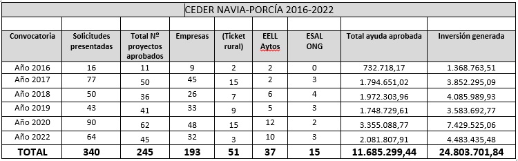 Las seis convocatorias anuales de las ayudas LEADER en el Navia-Porcía han favorecido la inversión privada generando un efecto multiplicador que se traduce en que cada euro de ayuda pública ha supuesto una inversión subvencionada de 2,25 euros. Todo ello ha permitido mantener el desarrollo del tejido empresarial de la comarca pero también mejorar la calidad de vida de sus habitantes a través de las inversiones no productivas. El nivel de ejecución de la Estrategia de Desarrollo Local Participativo (EDLP) es indiscutiblemente positivo, como ponen de manifiesto las cifras de ayuda aprobada, que supera el 100% de la prevista inicialmente, con un nivel de ejecución (pagos) que ya supera el 88%.