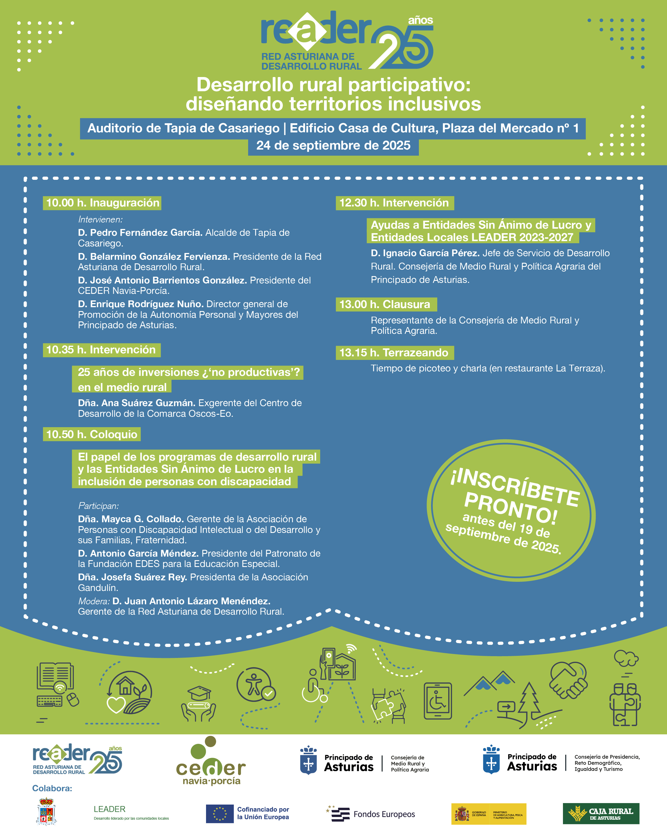 El martes 24 de septiembre el CEDER Navia Porcía organiza la jornada Desarrollo rural participativo: Diseñando territorios inclusivos en el marco de los actos con motivo del 25 aniversario de la Red Asturiana de Desarrollo Rural. El encuentro se celebrará en el Auditorio de Tapia de Casariego, ubicado en la Casa de Cultura de la villa tapiega.