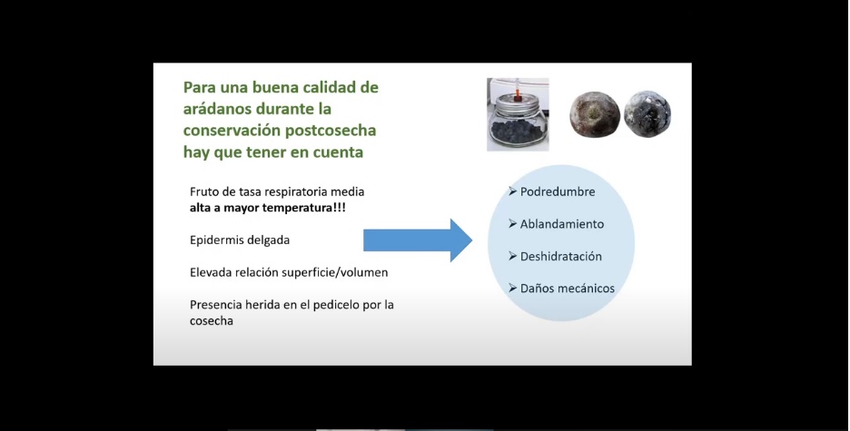 Además de estos parámetros de conservación, esta investigadora incidió mucho en la importancia de conocer la variedad de frutos con los que se está trabajando. Dependiendo de la variedad, los tiempos de durabilidad del producto y la influencia de los factores antes mencionados cambian mucho. Por ello, tanto en las producciones de arándanos como en la de cualquier tipo de frutos, hay que saber qué variedades se están cultivando y cuáles son sus cualidades para tenerlas en cuenta a la hora de definir el tratamiento postcosecha que se les va a dar.