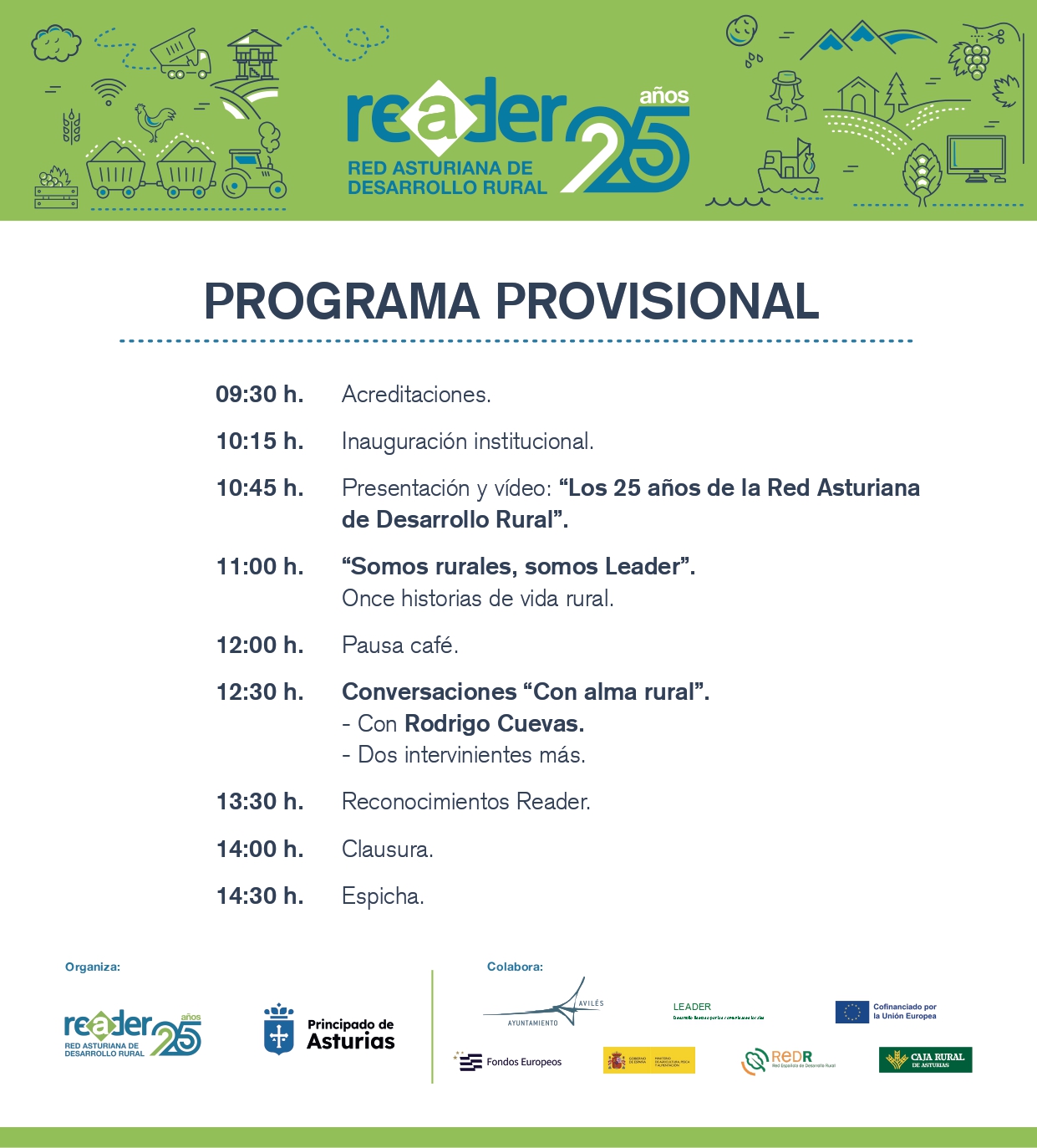 Avanzamos el programa provisional para el gran acto central del 26 de junio con motivo del 25 aniversario de la Red Asturiana de Desarrollo Rural el jueves 26 de junio desde las 09.30 horas en el Centro Niemeyer de Avilés. El evento contará con la presencia del presidente del Principado de Asturias, Adrián Barbón, mientras que el agitador folclórico Rodrigo Cuevas ya ha confirmado su participación para una conversación con alma rural: